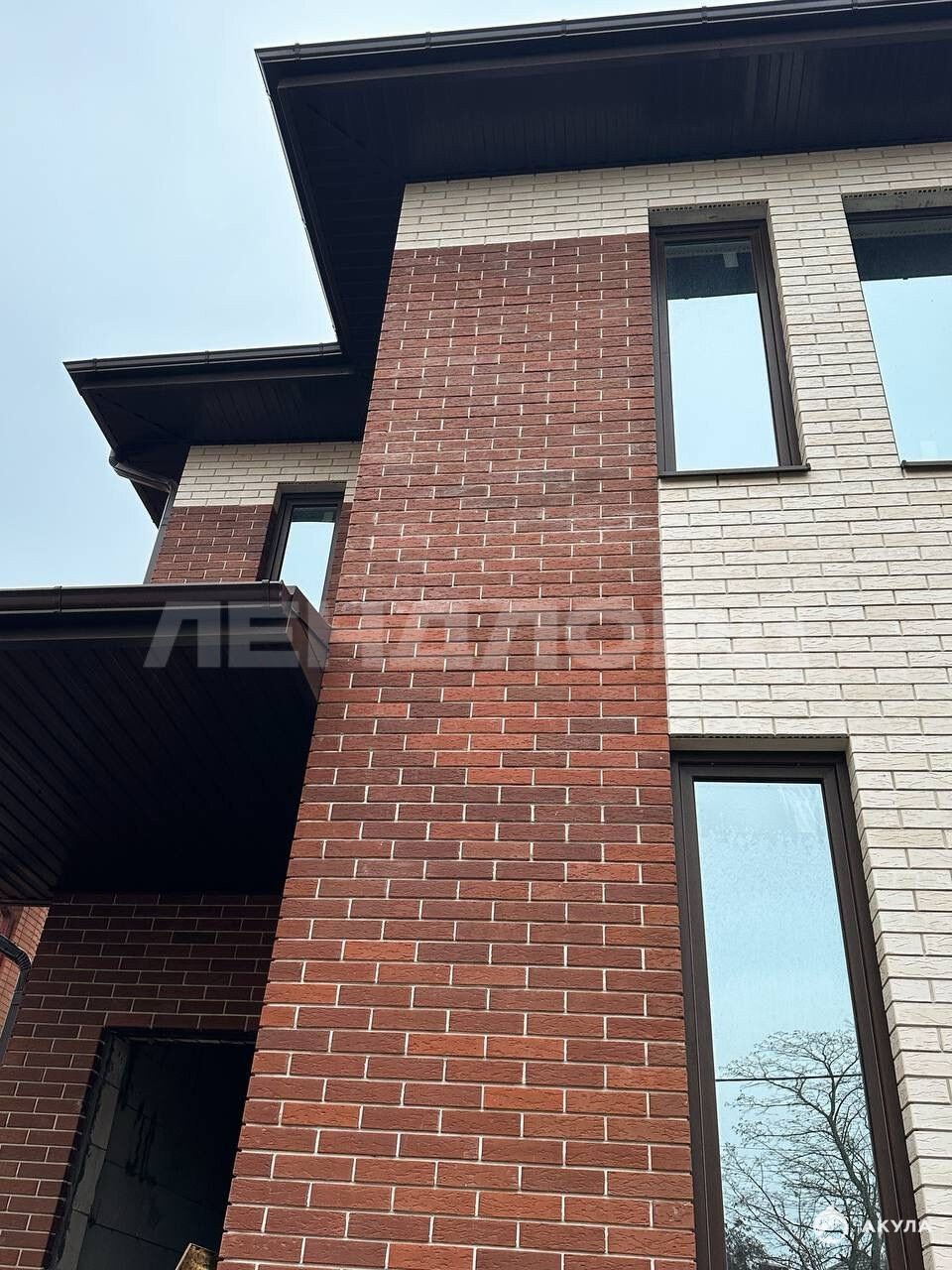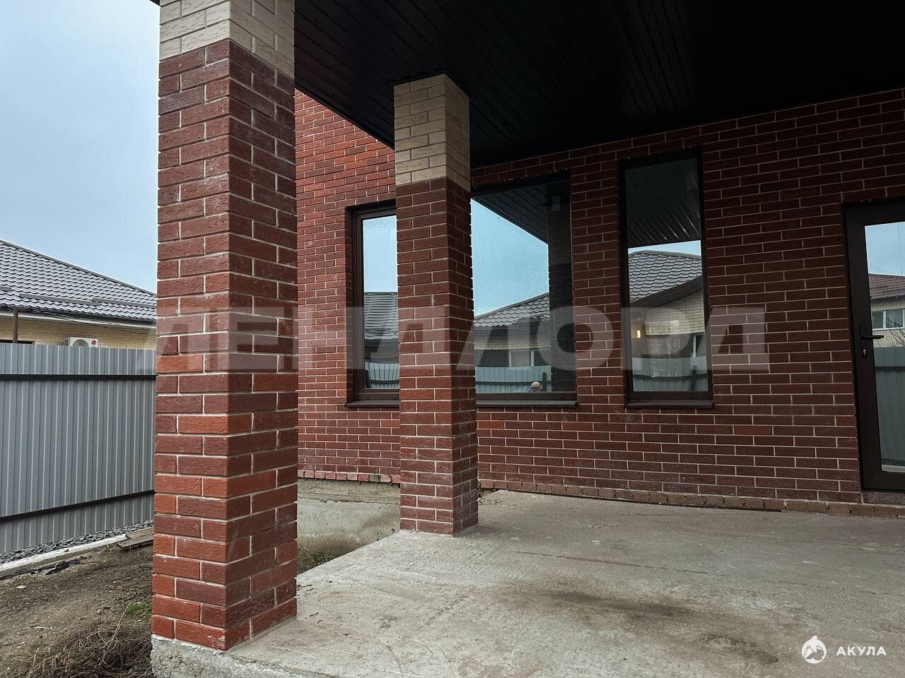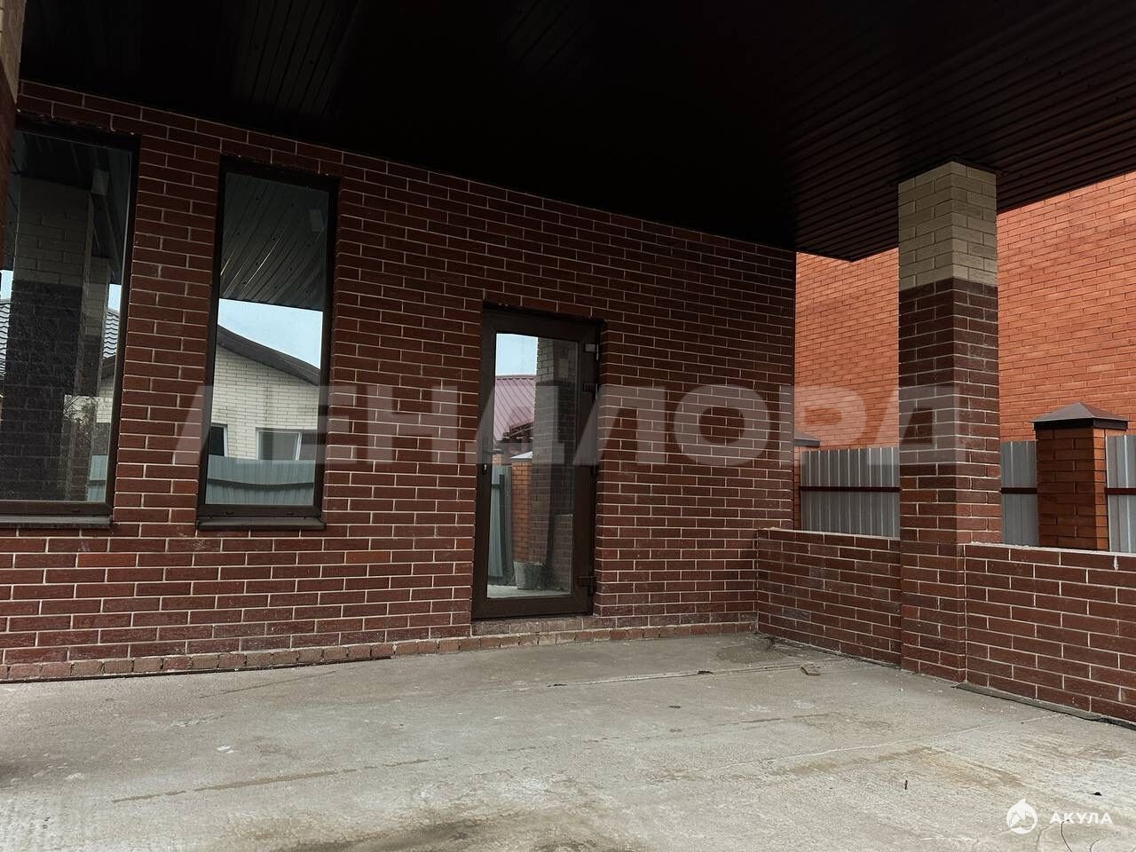 Фасад дома полностью из кирпича, въездные ролл ворота.