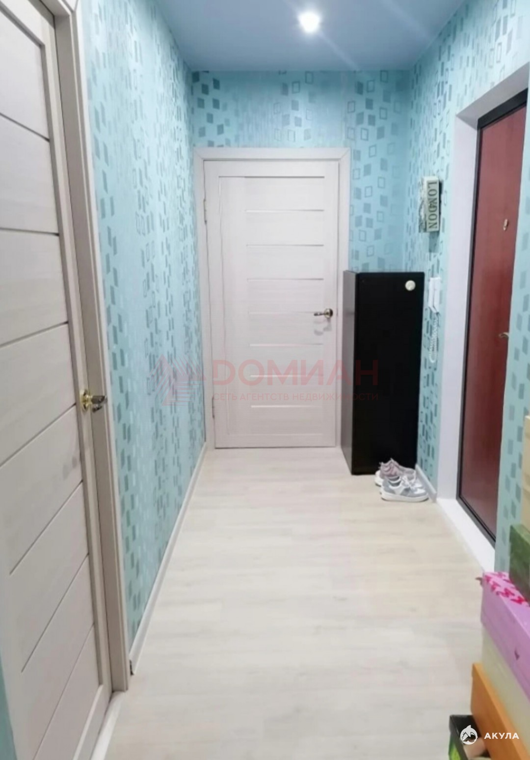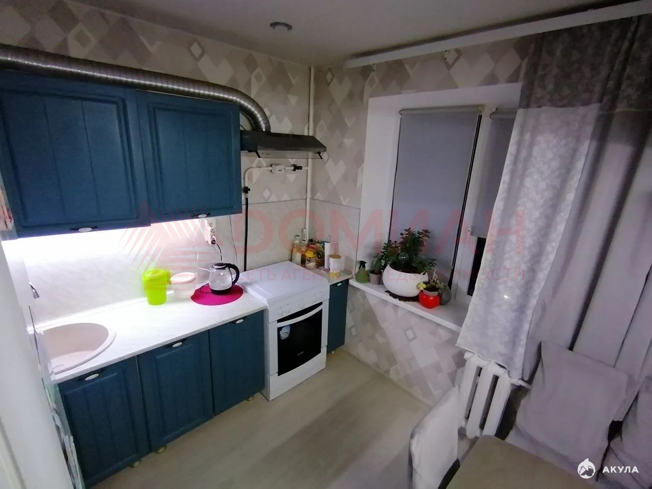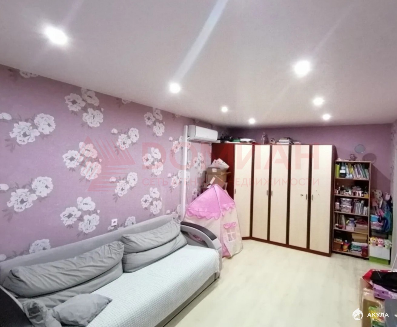 Комнаты раздельные, санузел раздельный. Балкон застеклен, утеплен, комнаты, кухня, коридор: обои, натяжные потолки, точечные светильники, промышленный линолеум, ванна — туалет плитка на полу, стены пластик. Остается кухонный гарнитур, вытяжка, газовая плита, сплит система.
