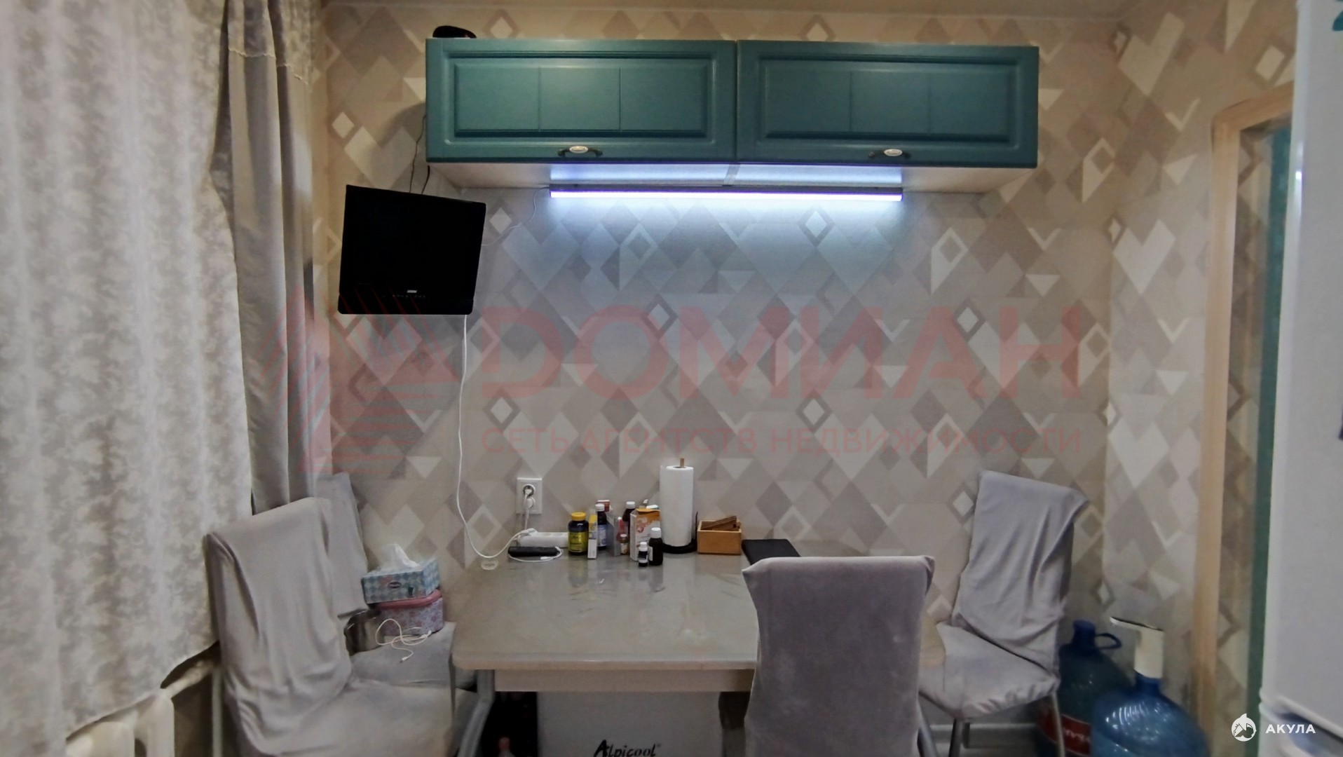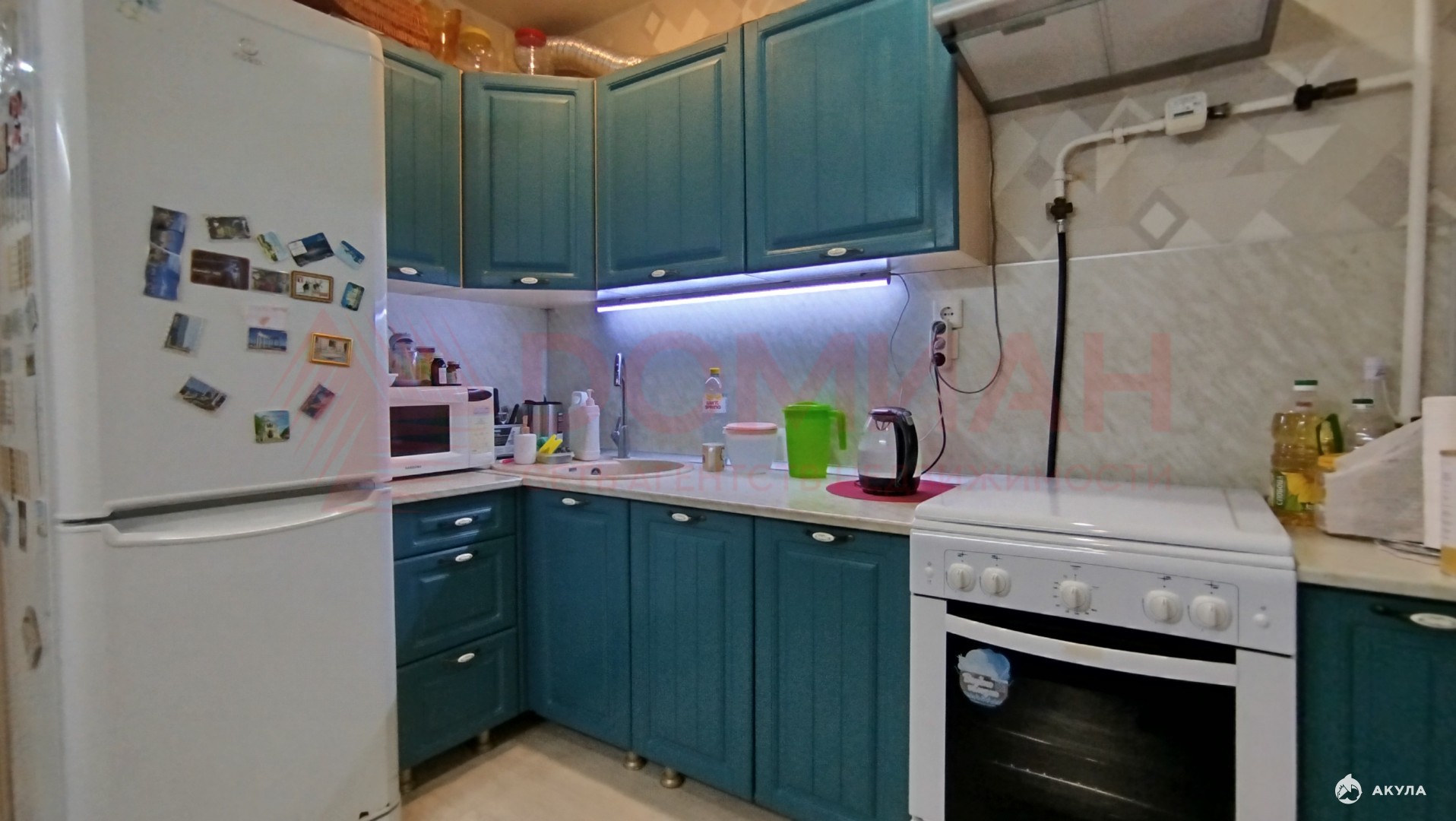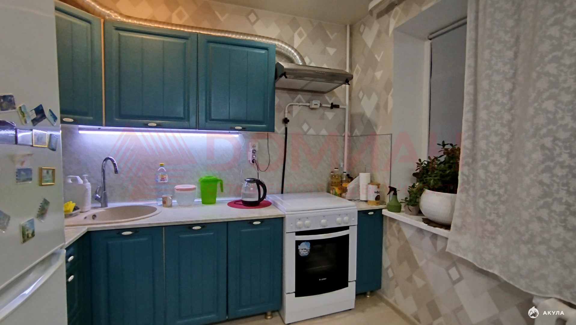 Комнаты раздельные, санузел раздельный. Балкон застеклен, утеплен, комнаты, кухня, коридор: обои, натяжные потолки, точечные светильники, промышленный линолеум, ванна — туалет плитка на полу, стены пластик. Остается кухонный гарнитур, вытяжка, газовая плита, сплит система.