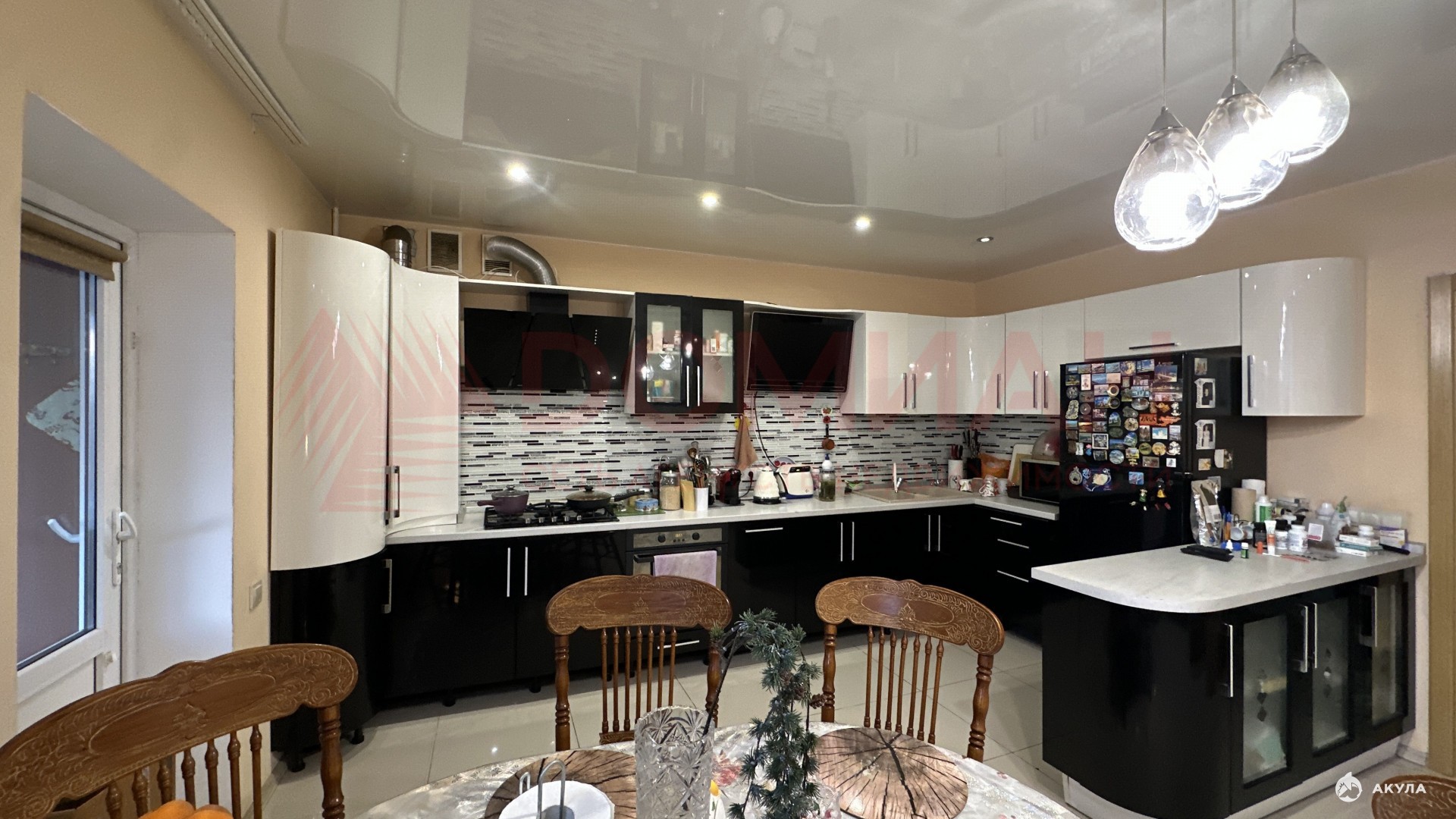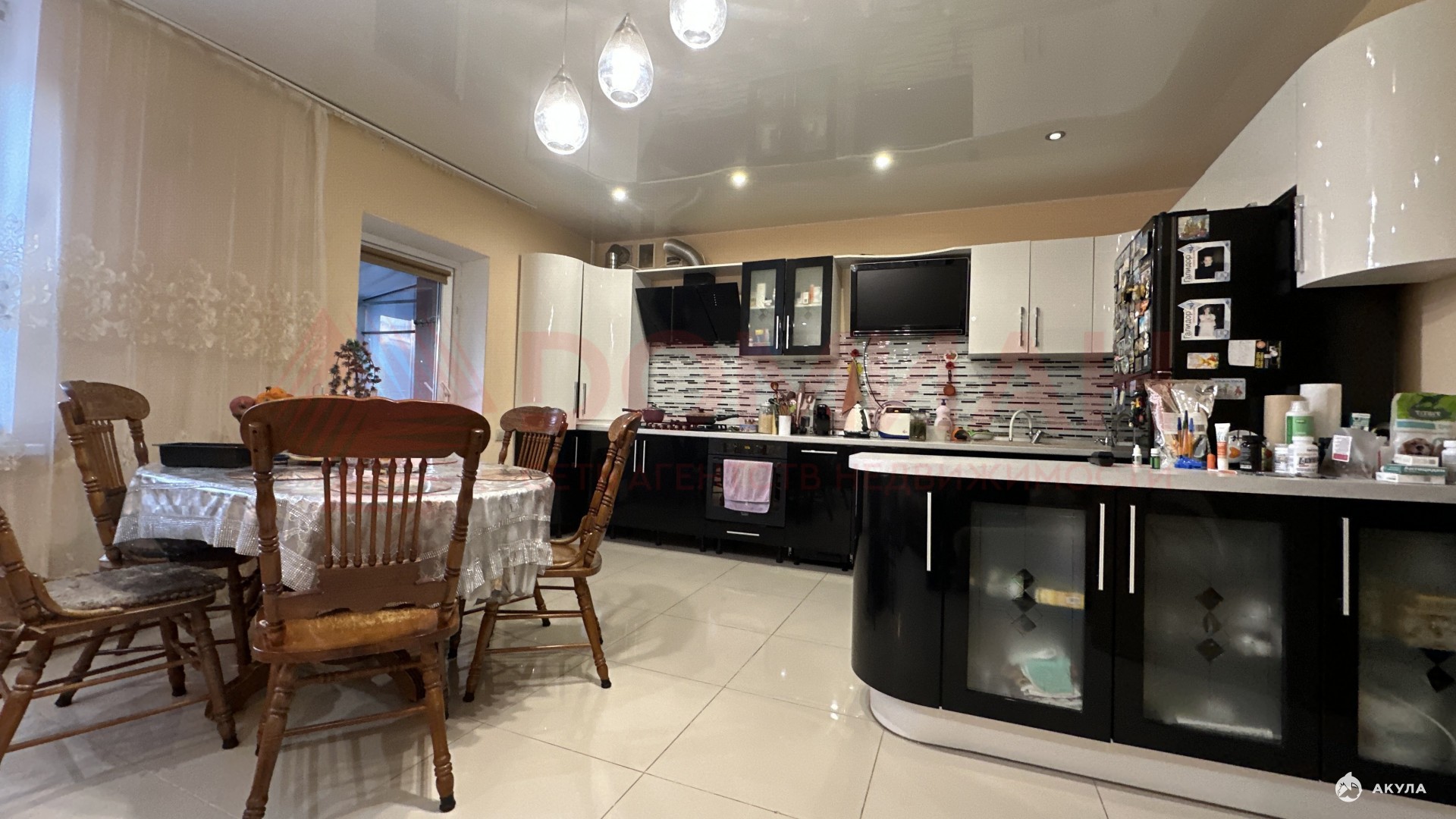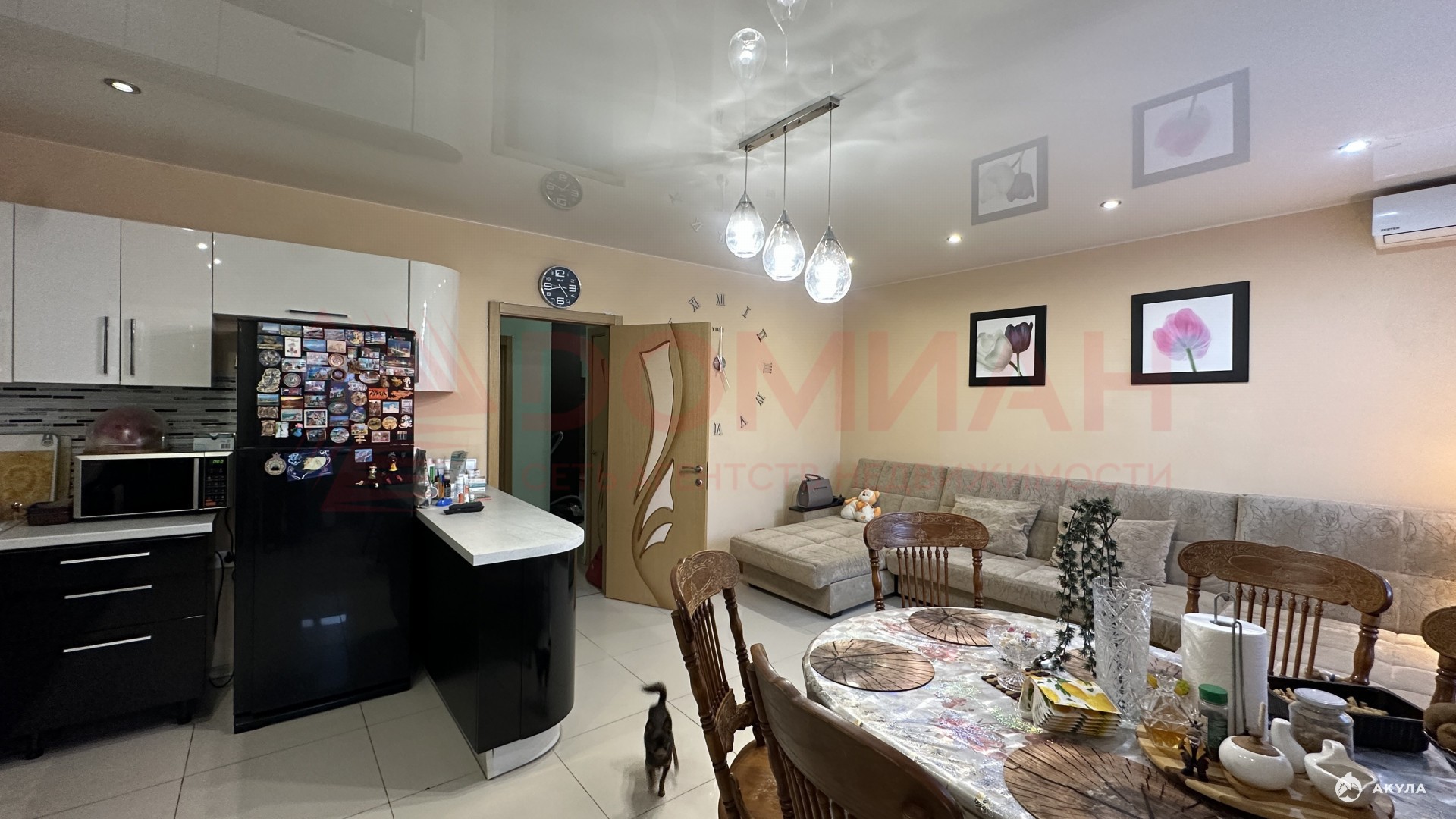 – Кухня-гостиная : Просторная кухня-студия с современными бытовыми приборами, которая разделена на гостиную и обеденную зону с выходом на застекленную террасу.