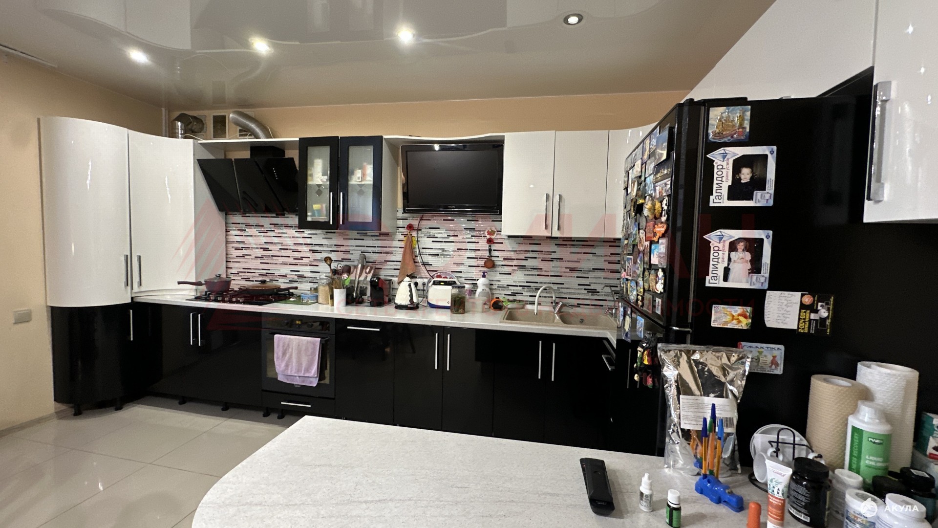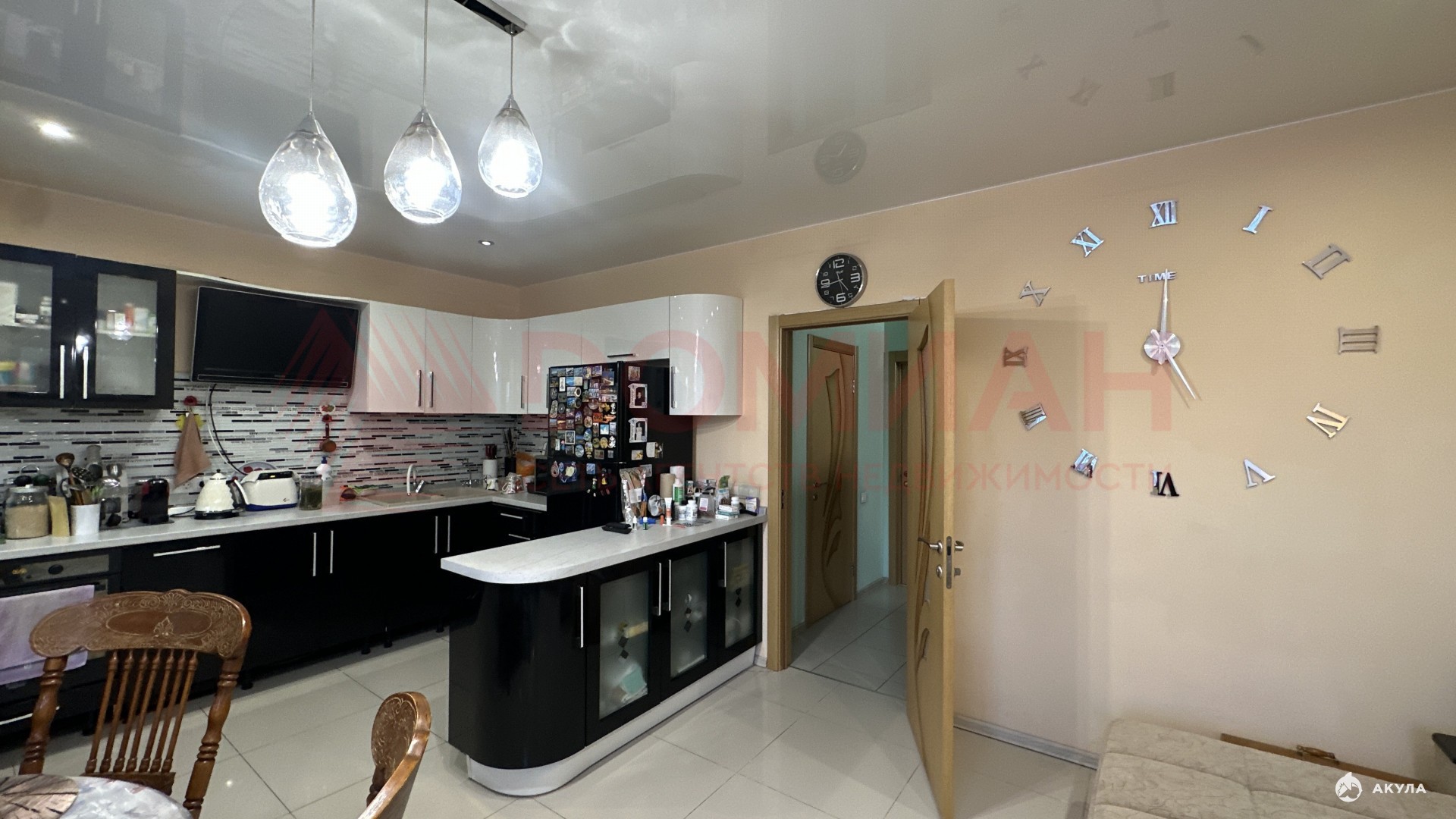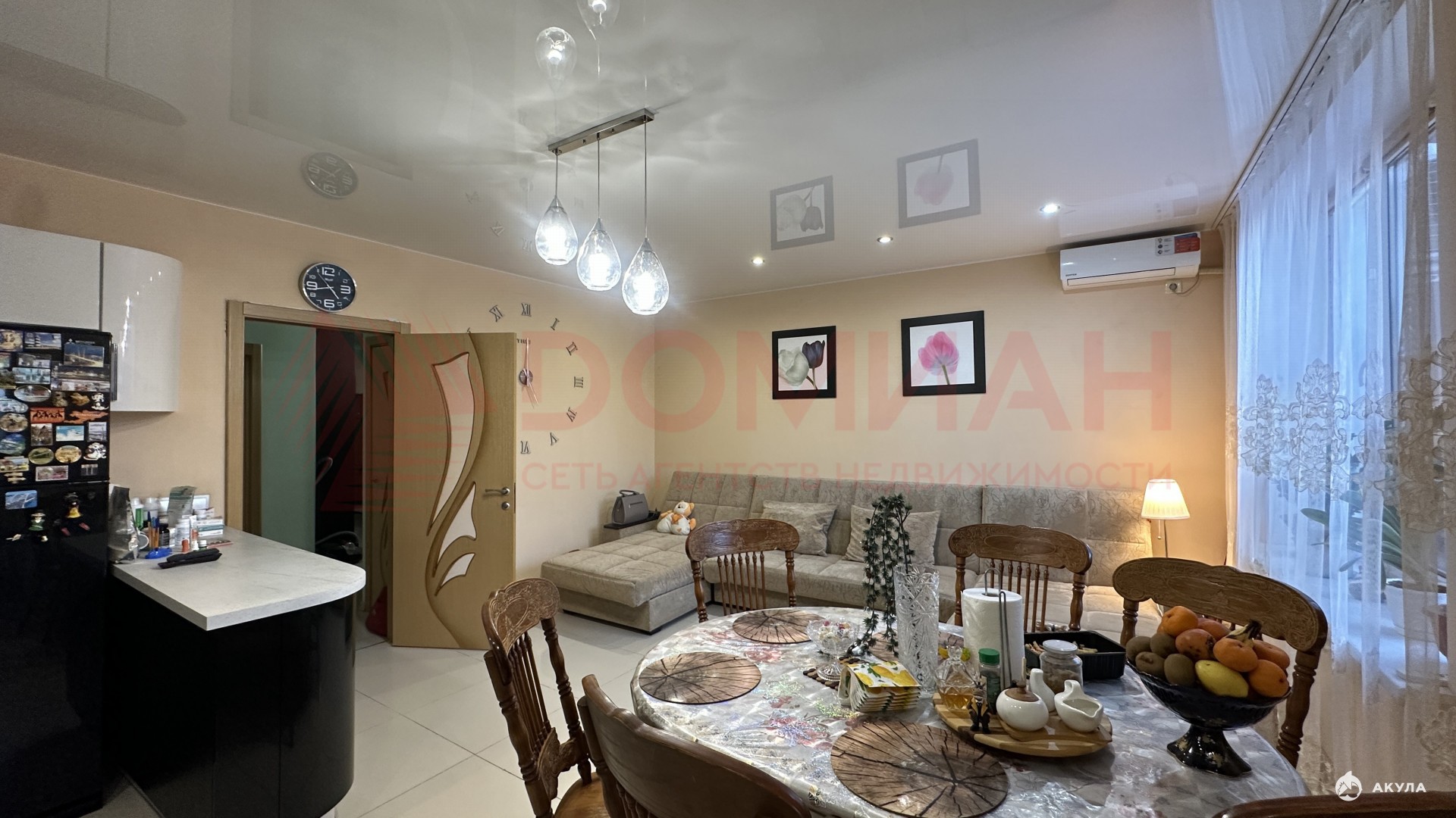 – Кухня-гостиная : Просторная кухня-студия с современными бытовыми приборами, которая разделена на гостиную и обеденную зону с выходом на застекленную террасу.