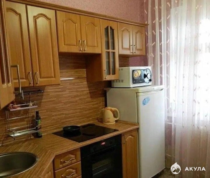 Полностью оборудованная кухня: холодильник, плита с 4 конфорками, духовка, микроволновка, электрический чайник, небольшой набор посуды.